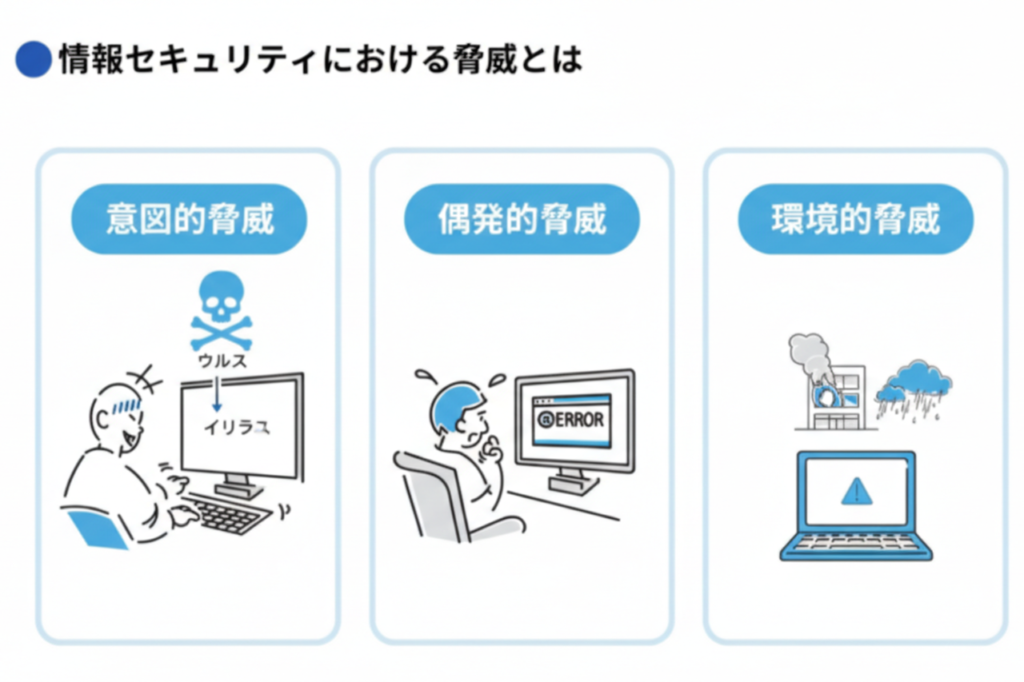 情報セキュリティにおける「脅威」とは、情報資産に損失を与える要因のことで、以下の3つの側面に分類されます。